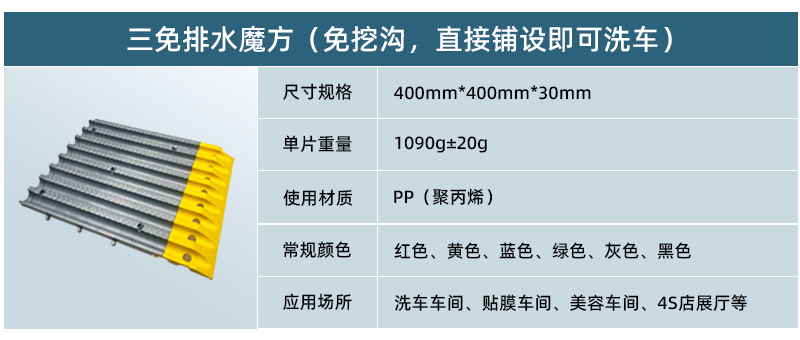 1、免挖溝,直接鋪設(shè)即可洗車。 2、免清淤,泥沙順自有排水溝直接排走。 3、免防水,接口處打防水膠后徹底防漏水。 4、非常耐用,容易清理、耐油脂、酸和化學(xué)品。 5、極佳承重載力,適合高人流量及轎車通過場所。