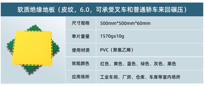 軟質(zhì)絕緣地板能將每個(gè)獨(dú)立的地板快速拼裝成整體地面,專利型鎖扣結(jié)構(gòu)連接能力更強(qiáng),可承受叉車的來回碾壓。施工過程中無需膠黏劑等材質(zhì),具有施工簡(jiǎn)單快速、色彩絢麗、美觀大方、可移動(dòng)性強(qiáng)、可重復(fù)使用等特點(diǎn)。